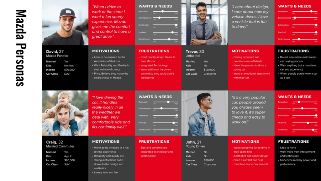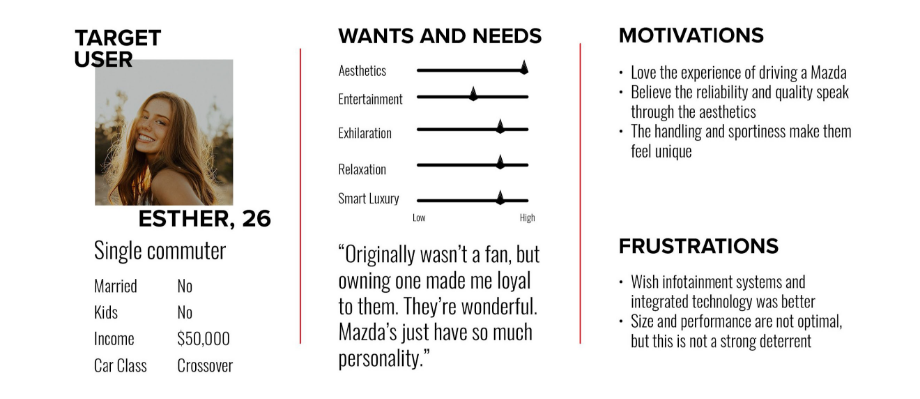 The Mazda customer has high expectations of reliability and quality when they see the design and aesthetics of a Mazda. They want and emotional attachment with their vehicle and a fun exhilarating driving experience. They view their vehicle as an extension of themselves. Although they love the low cost luxury that Mazda provides, they are willing to spend more to get the premium Mazda experience .