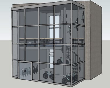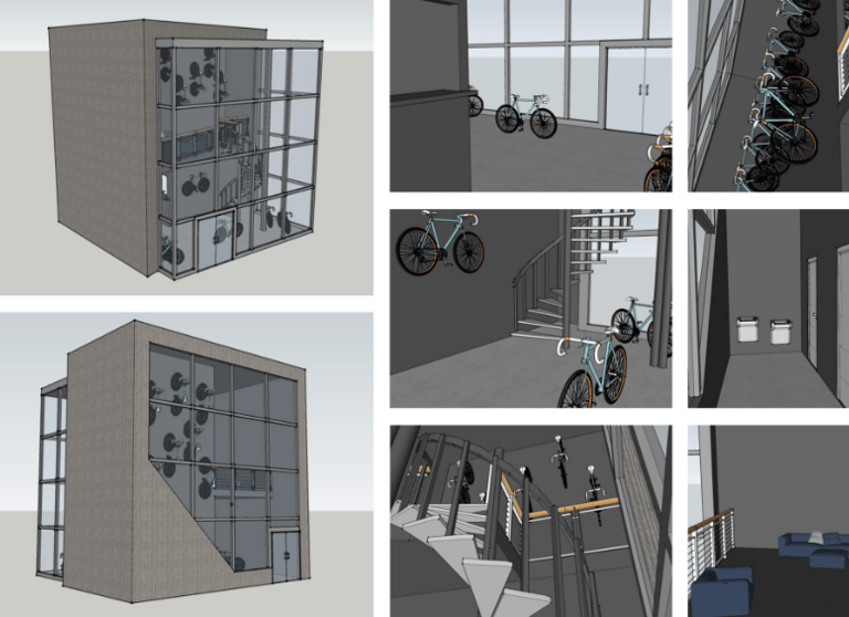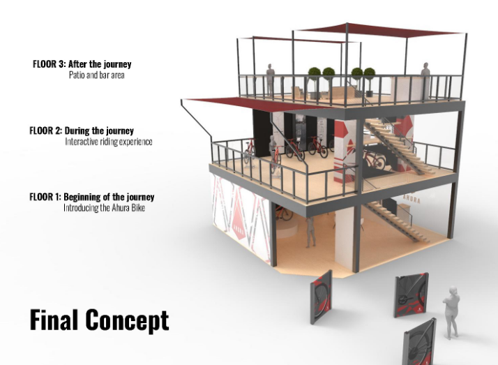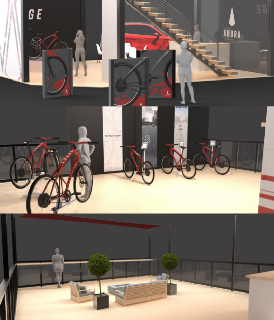 I worked with the environment team; as a designer who worked as an architectural designer with different firms, I had an insight into designing a feasible environment. First, as a team, we developed the environment floor plans, then each of us designed graphics for the environment and then furniture and casework for the store. One of the items I created personally for this environment was the bike stands for the showroom inspired by the logo.